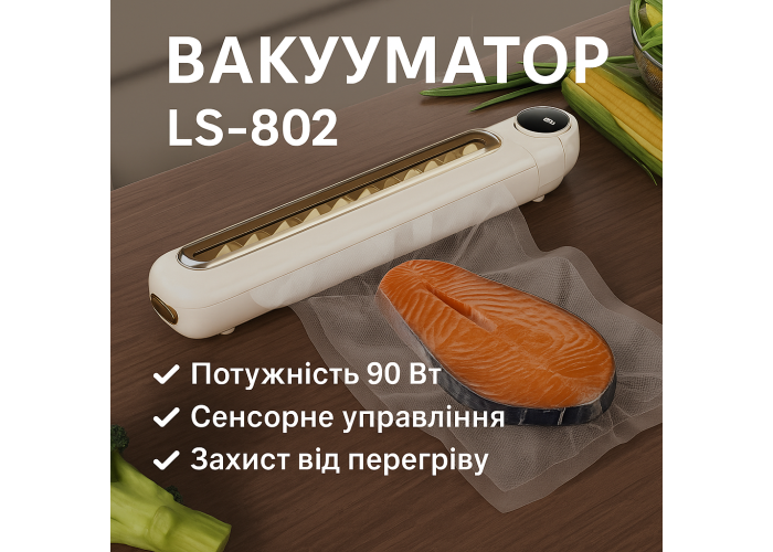 Вакуумний пакувальник LS-802— це побутовий автоматичний апарат, призначений для надійного пакування продуктів зі збереженням їхньої свіжості та смакових якостей. Пристрій допомагає продовжити термін зберігання продуктів і захистити їх від зовнішніх чинників, як-от волога та повітря.