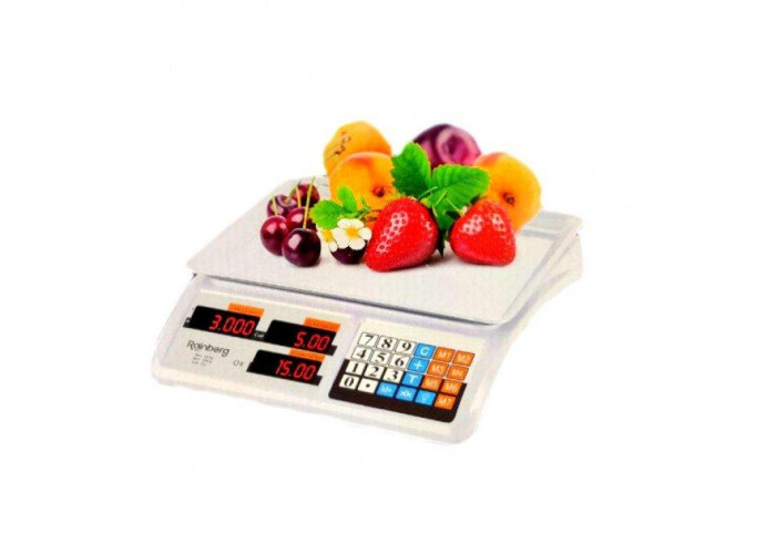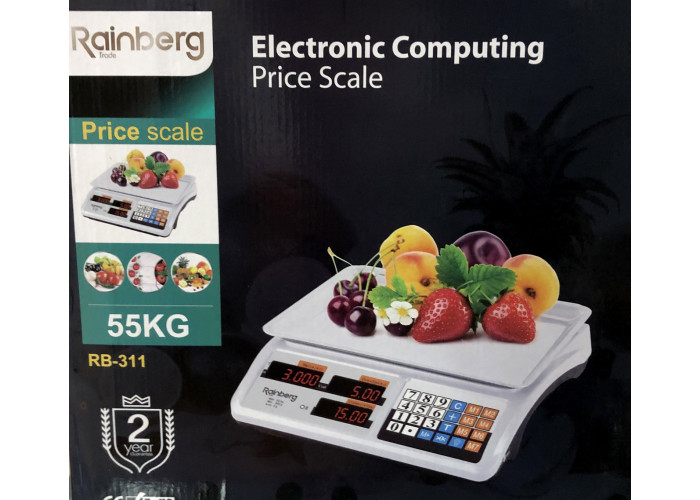 Електронні торговельні ваги Rainberg RB-311 призначені для торгівлі в магазинах, ринкових точках та ін. Найбільша межа зважування — продукція масою до 55 кг. Для зручного зважування та розрахунку передбачений двосторонній дисплей із підсвіткою (покупювач-продавець), на який виводиться вся інформація про вагу та ціну товару.