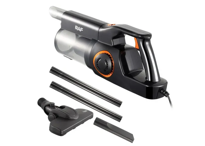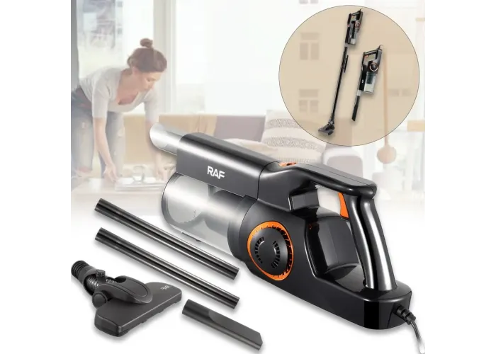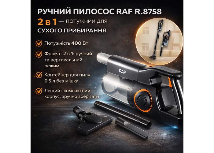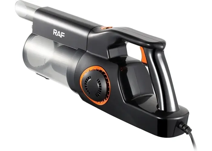 Ручний пилосос RAF R.8758 — це компактний і потужний прилад для сухого прибирання будинку, квартири або автомобіля. Він обладнаний двигуном потужністю 400 Вт, що забезпечує сильне всмоктування пилу, крихт і дрібного сміття з різних поверхонь. Завдяки конструкції «2-в-1» пристрій може використовуватися як вертикальний пилосос для підлоги та як ручний — для меблів, щілин і сидінь автомобіля. Контейнер для збирання пилу об'ємом 0,5 л легко спустошується й миється, що робить обслуговування простим і гігієнічним. Пристрій підходить для щоденного сухого прибирання й дає змогу підтримувати чистоту швидко й ефективно.