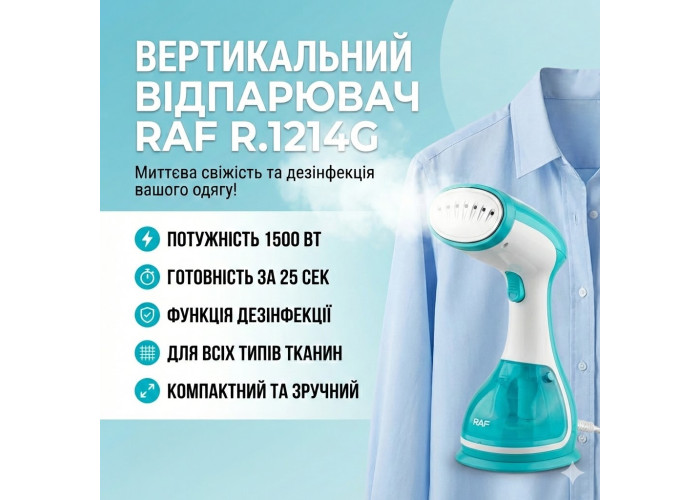 RAF R.1214G — це популярна модель цієї фірми, яка заслужила свій статус на ділі. Пристрій дає змогу працювати з усіма типами речей і сумісно з елементами декору, недоступними для класичної праски. Девайс швидко приведе Ваші речі в лад, зробивши їх випрасованими та показними. Відпарювач має антипригарне покриття, зроблене з неіржавкої сталі. Висока потужність 1500 Вт і знімний резервуар на 300 мл роблять RAF R.1214G чудовою заміною для звичайної праски. Час нагрівання до готовності до роботи становить лише 25 секунд.