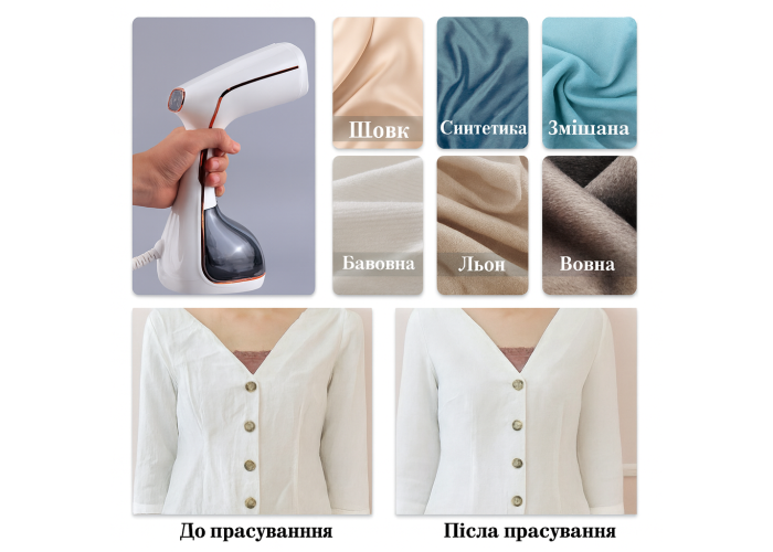 Безпека для тканин: Парове оброблення не деформує волокна, підходить для шовку, синтетики, бавовни, вовни та льону.