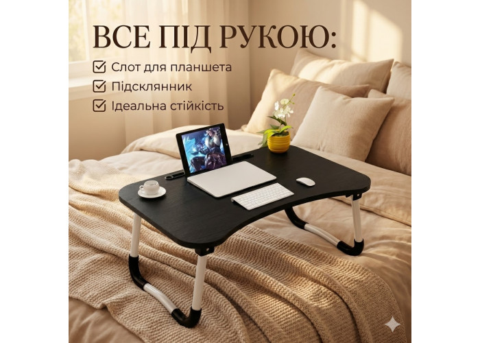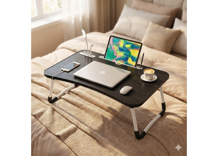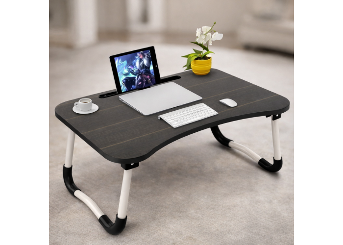 Удобный портативный складной столик для ноутбука — идеальное решение для тех, кто работает дома, в офисе или на отдыхе. Этот компактный столик сочетает в себе эргономичный дизайн, устойчивость и функциональность, обеспечивая комфортную рабочую поверхность для ноутбука, планшета или книг, а также дополнительный держатель под стакан.