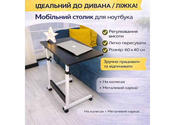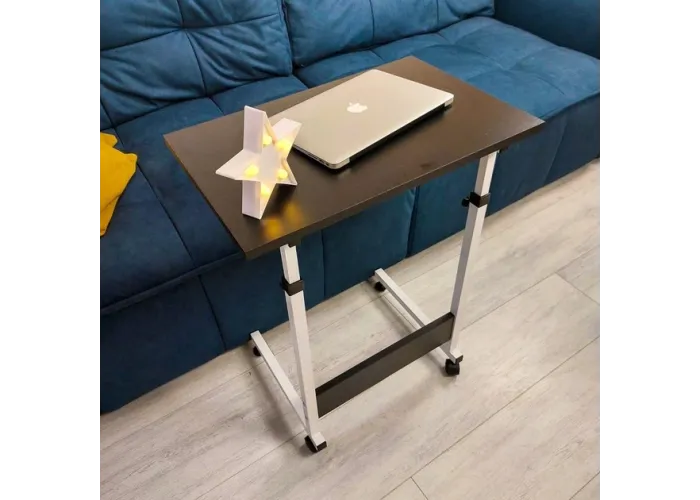 Столик для ноутбука Megusta — это компактный мобильный стол с регулировкой высоты, предназначенный для работы, учёбы или отдыха дома. Конструкция на колёсах позволяет легко перемещать столик по комнате и использовать его рядом с диваном, кроватью или креслом.
