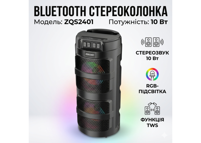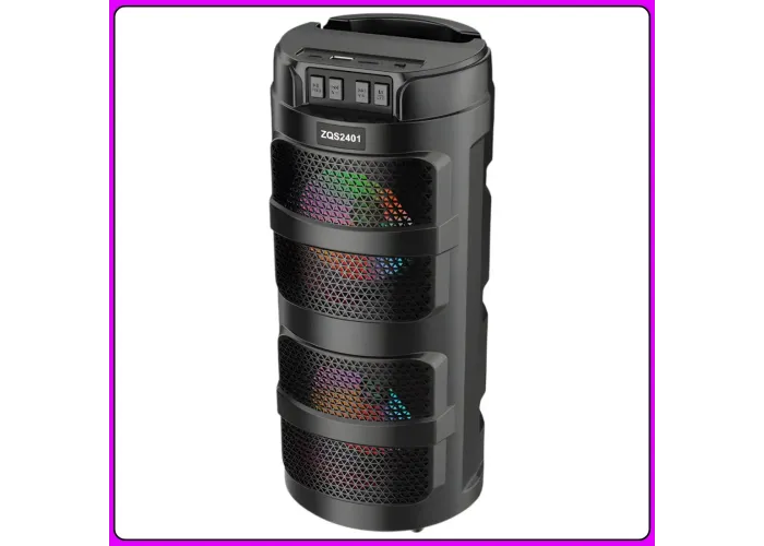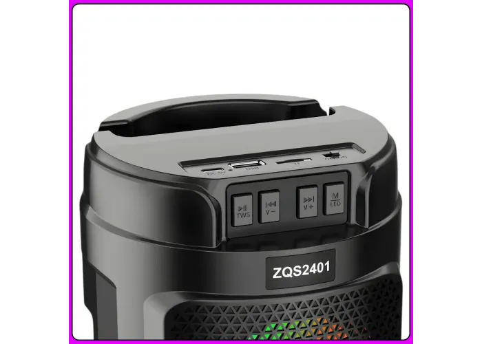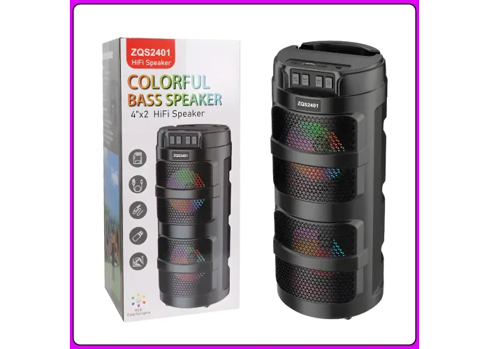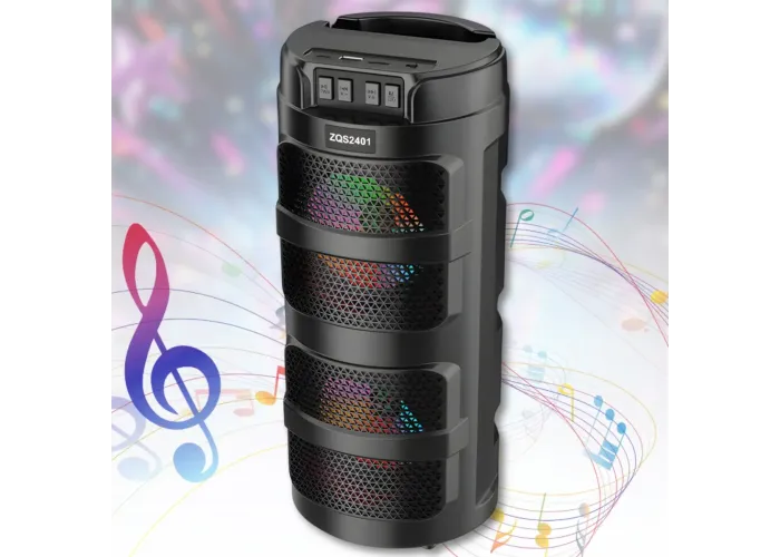 Портативная Bluetooth колонка ZQS2401 - это компактная акустическая система со стереозвучанием, предназначенная для прослушивания музыки дома, на прогулке или во время отдыха. Устройство оснащено двумя 4-дюймовыми динамиками мощностью 2×5 Вт, которые обеспечивают чистое и достаточно громкое звучание. RGB-подсветка создает дополнительный визуальный эффект во время воспроизведения музыки и делает колонку стильным аксессуаром для развлечений.