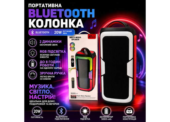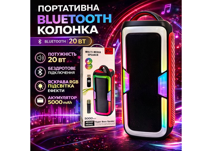 Портативная Bluetooth колонка JQS4407 – это стильное и мощное решение для прослушивания музыки дома, на природе или в дороге. Благодаря мощности 20 Вт и двум динамикам колонка обеспечивает громкий, чистый и насыщенный звук с выраженными басами.