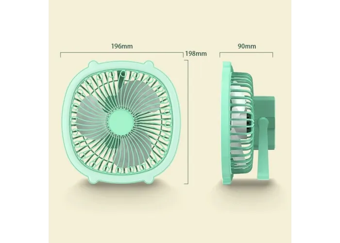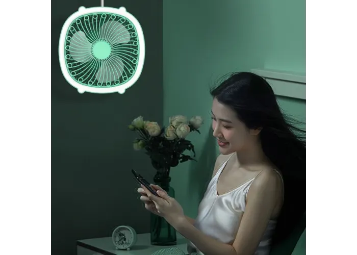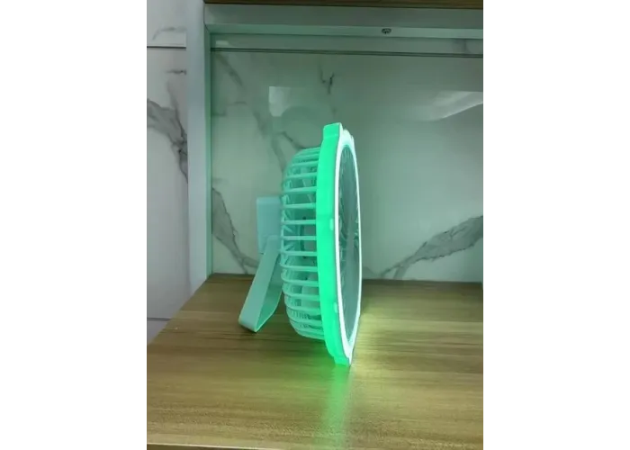 Настольный вентилятор с подсветкой можно установить на стол, а также подвесить за специальную ручку на стену или под потолок. Компактный настольный вентилятор с подсветкой обеспечит вам комфорт в городской квартире, загородном доме, на даче, кемпинге, рыбалке или в офисе. Вентилятор заряжается от USB. Также имеет встроенный литиевый аккумулятор 1200 мАч.