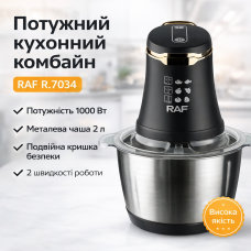 Блендер комбайн на 1500 Вт RAF R.7034 Измельчитель чоппер на 2 л с металлической колбой кухонный RAF R.7034 - это портативный и многофункциональный измельчитель, блендер, мясорубка, мельница для быстрого измельчения как мягких продуктов, таких как: фрукты, перец, смешивание различных соусов, яиц, так и твердых продуктов, таких как: мясо, овощи, зерна кукурузы, бобовые, корни растений, кофе, бобы, ..