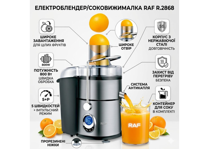Электрический блендер/соковыжималка RAF R.2868 - универсальное устройство для кухни, позволяющее готовить свежие соки, смузи, коктейли и другие напитки в домашних условиях. Мощность 800 Вт обеспечивает быструю обработку даже твердых фруктов и овощей, а пять скоростей с импульсным режимом позволяют точно контролировать консистенцию и текстуру приготовляемых напитков.