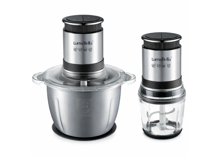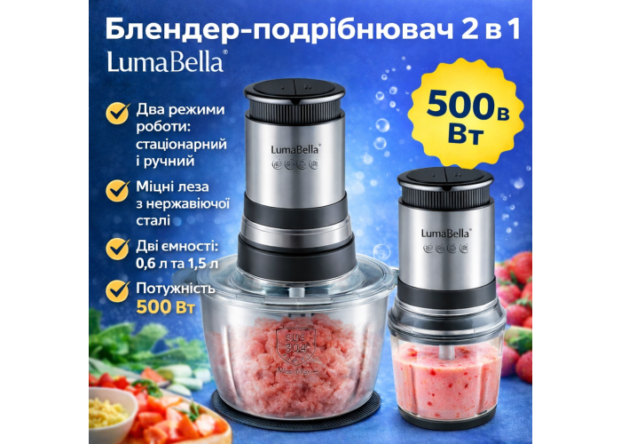 Многофункциональный измельчитель-блендер 2 в 1 LumaBella — универсальный помощник для кухни, который легко справляется с измельчением, смешиванием, приготовлением соусов, коктейлей, детского питания и измельчением овощей, фруктов, орехов и мяса. Устройство сочетает стационарный блендер и ручной погружной блендер в одном корпусе, что обеспечивает максимальное удобство и экономию места.