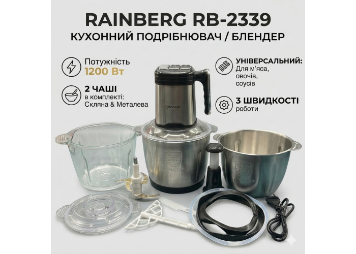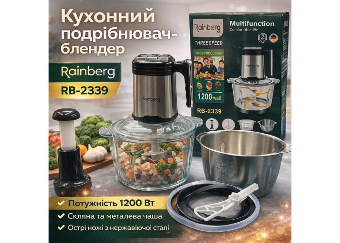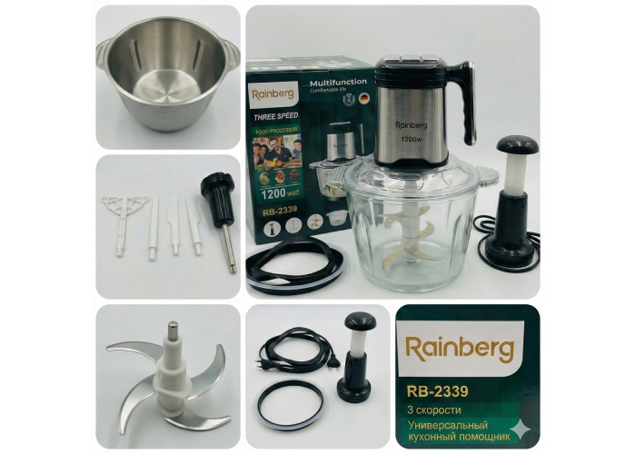 Кухонный измельчитель-блендер Rainberg RB-2339 — это удобный и функциональный помощник для ежедневного приготовления пищи. Устройство сочетает в себе высокую мощность 1200 Вт, простое управление и универсальность применения, позволяя быстро справляться с различными кухонными задачами.