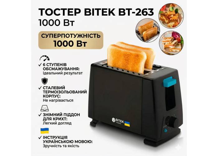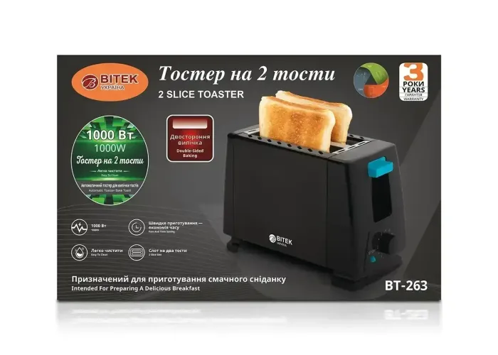 Тостер на 2 тоста и 1000 Вт BITEK BT-263 - представляет собой небольшое кухонное приспособление, выполненное в классическом стиле черного цвета. Благодаря своей удобной прямоугольной форме, он может легко разместиться в любом, даже самом небольшом уголке кухни.