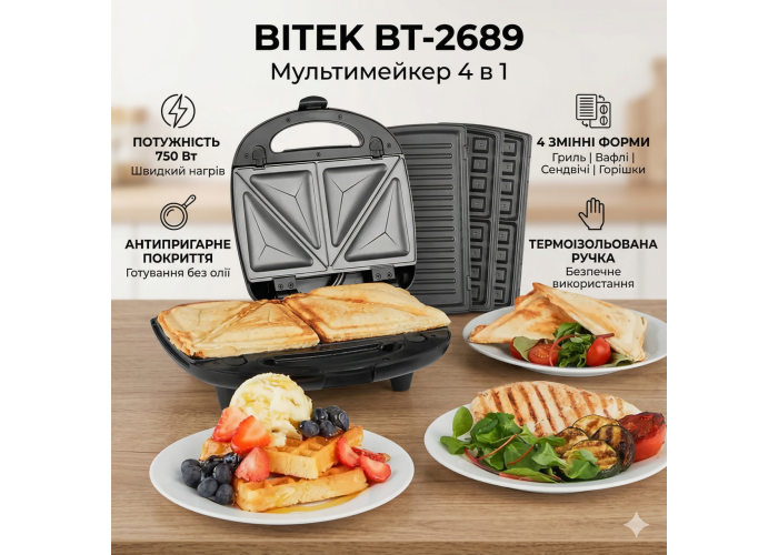 Сэндвичница 4 в 1 750Вт со сменными формами BITEK BT-2689 гриль, орешница, вафельница Гриль для сэндвичей
