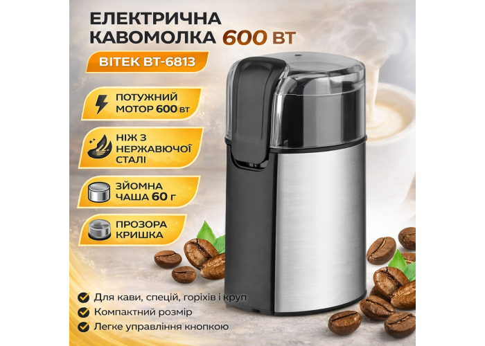 Электрическая кофемолка 600 Вт с чашей для зерен 60 г BITEK BT-6813