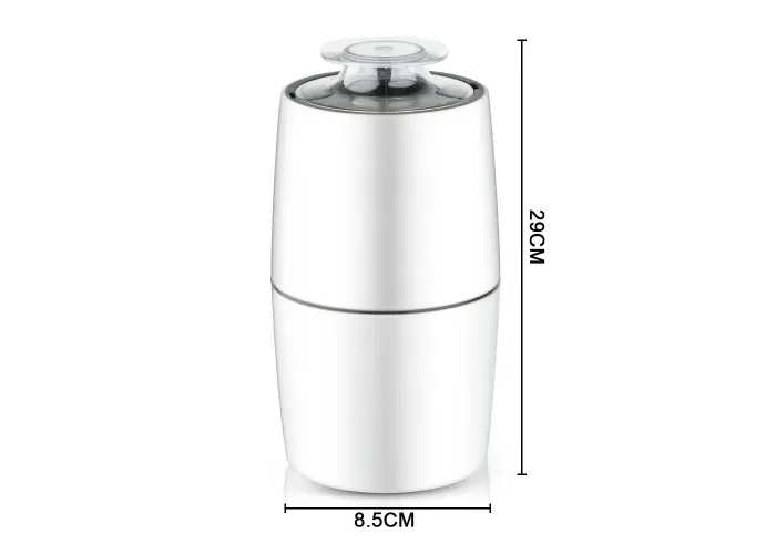 Модель выполнена в стильном корпусе белого цвета из прочного пластика. Компактный вертикальный дизайн высотой 29 см и шириной 8,5 см позволяет удобно разместить кофемолку даже на небольшой кухне. Прозрачная крышка позволяет контролировать степень помола без необходимости открывать прибор. Простое управление осуществляется через мягкий пальцевый переключатель.
