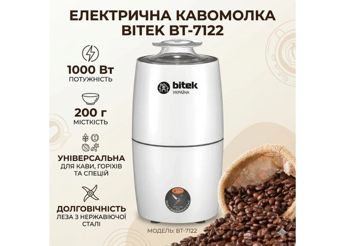 Электрическая кофемолка емкостью 200 мл BITEK BT-7122 1000W