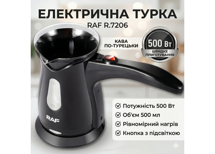 Электрическая кофеварка RAF R.7206 представляет собой компактную электрическую турку, предназначенную для быстрого приготовления ароматного кофе по-турецки в домашних условиях или в офисе. Благодаря мощности 500 Вт устройство обеспечивает равномерный нагрев, позволяя сохранить насыщенный вкус и аромат напитка. Удобный формат делает кофеварку практичным решением для ежедневного использования.