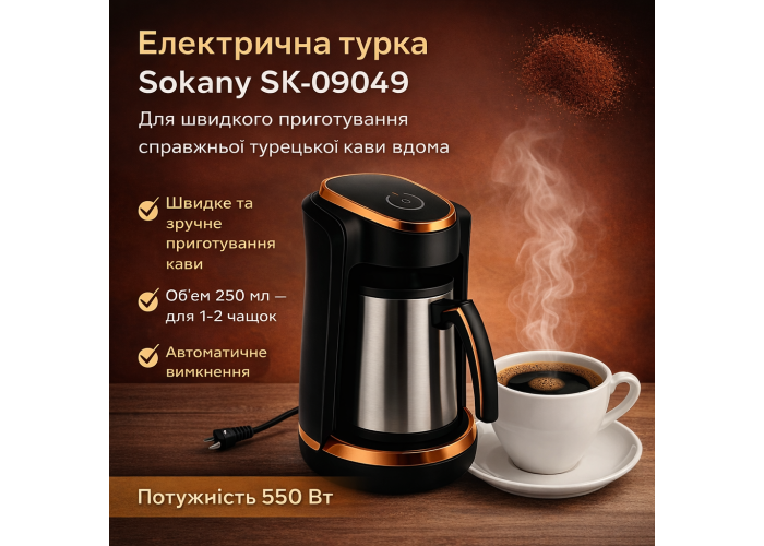 Електрична турка Sokany SK-09049 предназначена для быстрого и удобного приготовления турецкого кофе дома или в офисе. Устройство сочетает классический способ заваривания с современными технологиями, что позволяет получить насыщенный вкус и аромат кофе всего за несколько минут.
