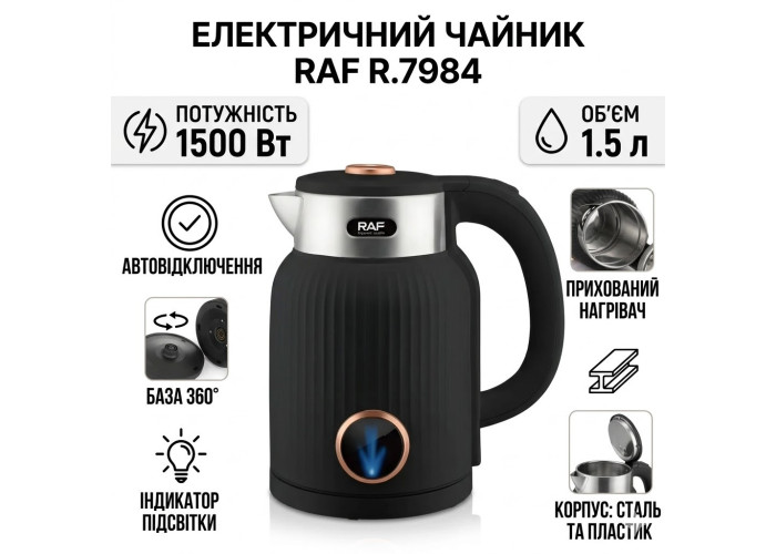Электрический чайник 1.5 л с автоматическим отключением и поворотной базой 360° RAF R.7984 1500W