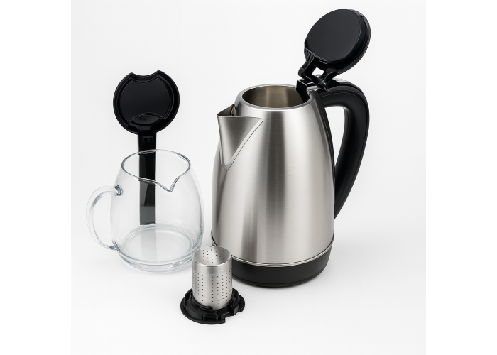 Электрочайник уверенно занимает важное место в нашем быту. Решающий фактор - удобство в использовании и быстрота закипания воды. Электрочайник является экологически чистым, ударопрочным, с удобным в обслуживании материалом, покрытие нагревательного элемента - нержавеющая сталь. Особенностью комплекта является подставка и заварник, в котором вы сможете не отходя от места заварить свой любимый чай.