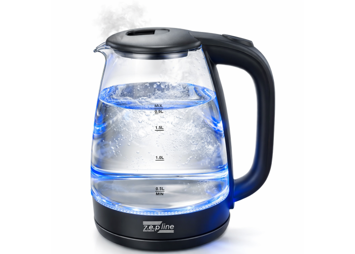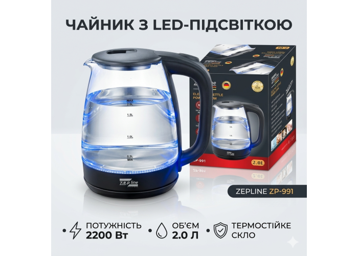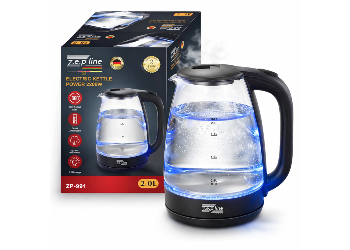 Электрочайник Zepline ZP-991 сочетает в себе современный дизайн, высокую мощность и экологичность материалов. Корпус выполнен из термостойкого закаленного стекла, что позволяет наблюдать за процессом закипания воды, который сопровождается эффектным синим LED-подсветкой. Благодаря высокой мощности в 2200 Вт, прибор обеспечивает быстрый нагрев 2 литров воды, экономя ваше время. Скрытый нагревательный элемент из нержавеющей стали гарантирует долговечность и легкость в уходе, а система автоматического отключения делает эксплуатацию устройства максимально безопасной.