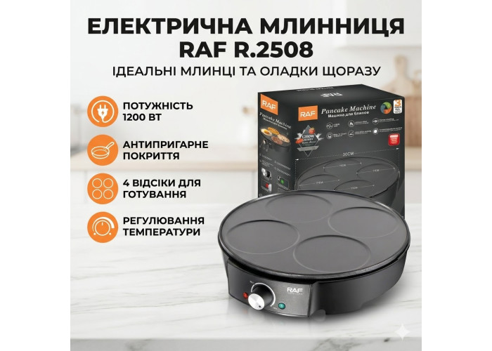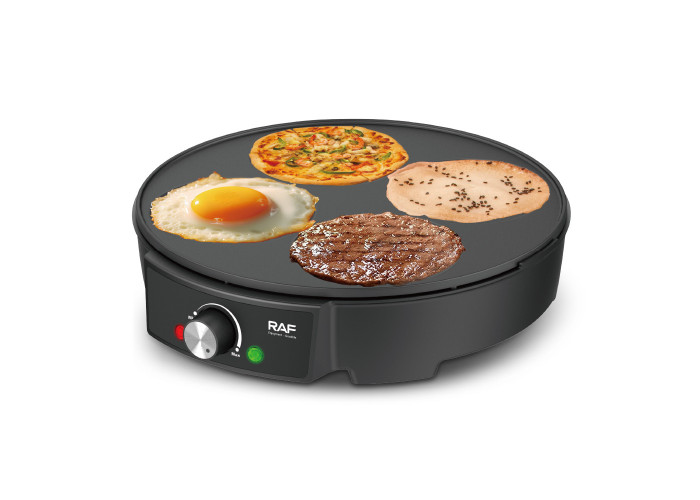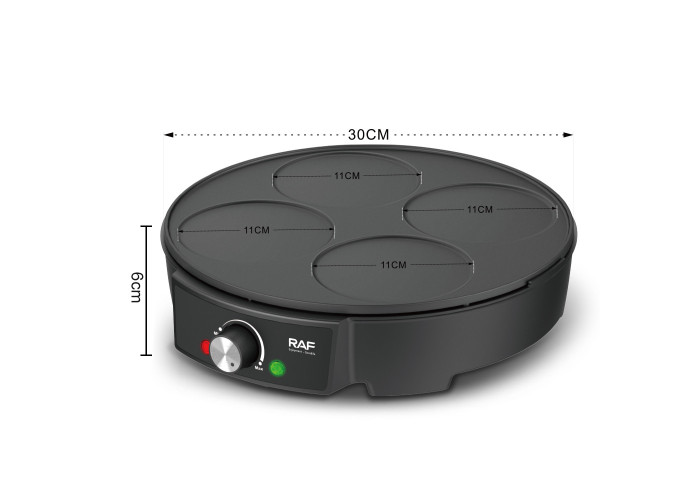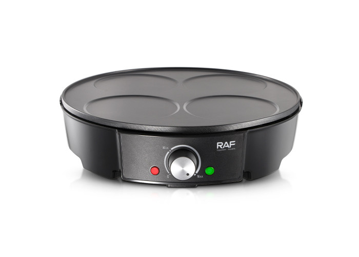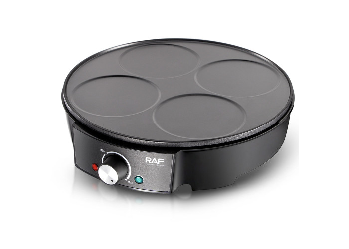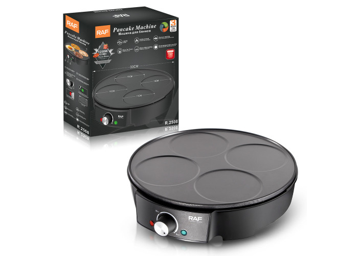 Описание Электрическая блинница RAF R.2508 — это мощное устройство для быстрого приготовления идеальных завтраков. Прибор оснащен рабочей поверхностью с 4 углублениями, что позволяет одновременно выпекать четыре аккуратных блинчика, панкейка, оладушка или сырника одинаковой формы. Благодаря высокой мощности 1200 Вт поверхность нагревается мгновенно и равномерно, обеспечивая идеальную прожарку. Качественное антипригарное покрытие позволяет готовить с минимальным количеством масла или вовсе без него, а также облегчает уход за техникой. Регулируемый термостат дает возможность контролировать температуру для получения желаемой степени румяности.