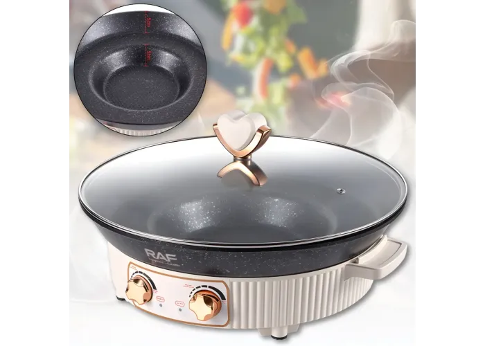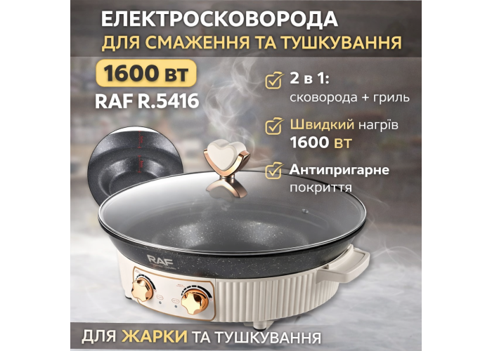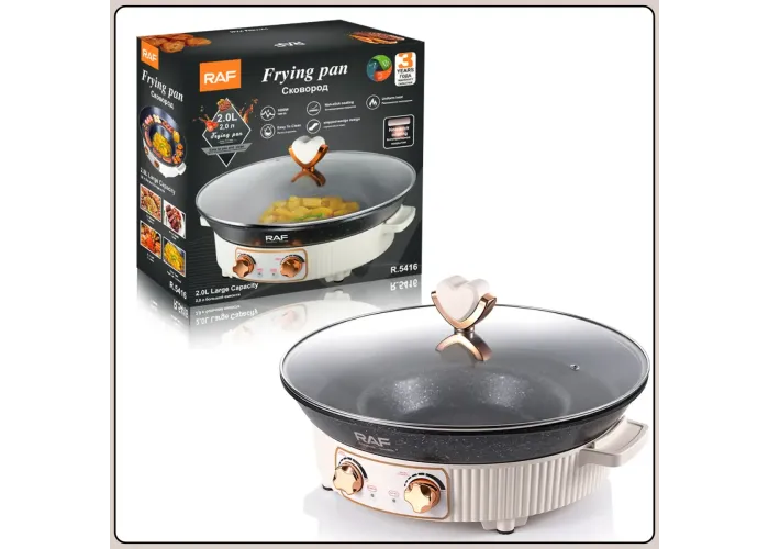 Электрическая сковорода RAF R.5416 представляет собой многофункциональное устройство 2 в 1, объединяющее возможности сковороды и гриля. Мощность 1600 Вт обеспечивает быстрый нагрев и стабильную температуру во время приготовления, что позволяет использовать прибор для жарки, тушения, приготовления барбекю и других блюд. Объем 2 литра подходит для повседневного домашнего использования и приготовления порций для семьи.