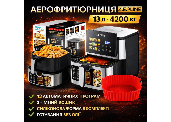 Аэрофритюрница Zepline ZP-00342 — это многофункциональное устройство для приготовления блюд с использованием циркуляции горячего воздуха. Общий объём рабочей камеры составляет 13 литров, что позволяет готовить порции для семьи или нескольких человек одновременно.