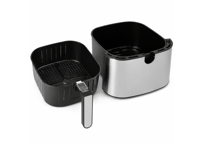 Корпус выполнен из нержавеющей стали и пластика. Конструкция включает съёмный корзин с антипригарным покрытием, что облегчает загрузку продуктов и очистку после использования. В комплект входит силиконовая форма, предназначенная для запекания и приготовления блюд внутри аэрофритюрницы.