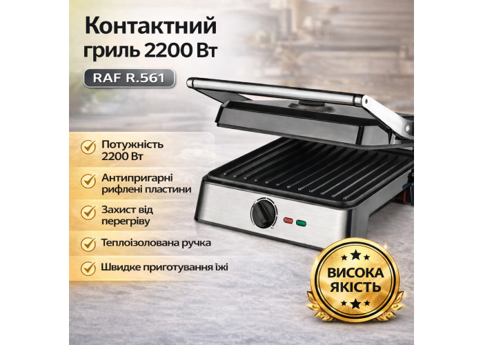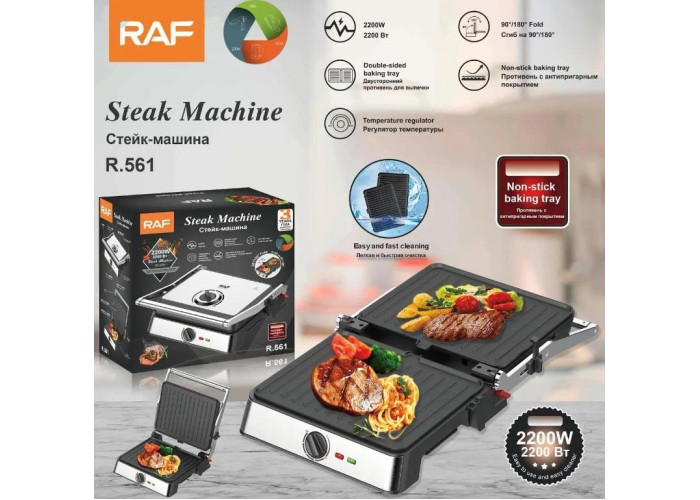 Прижимной контактный электрический гриль RAF R.561 двухсторонний настольный электрогриль с защитой от перегрева 2200 Вт