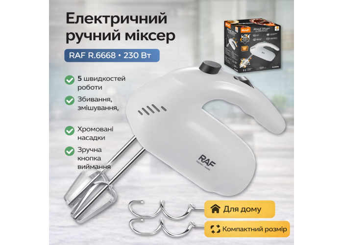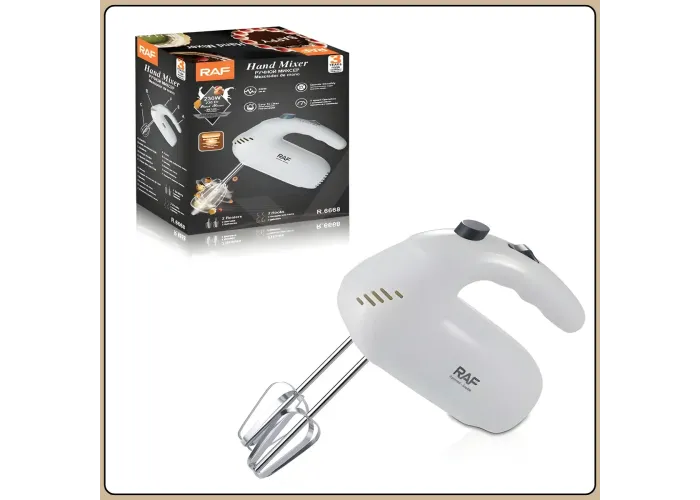 Электрический ручной миксер с 5 режимами работы и хромированными насадками RAF R.6668 230W