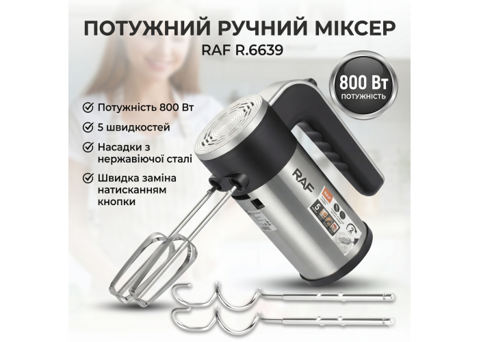 Электрический ручной миксер с регулировкой скорости и насадками RAF R.6639 800W