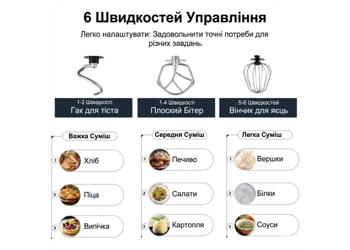 Большой объем чаши 6л позволяет замешивать большие порции теста или других ингредиентов, что удобно для приготовления больших объемов продукции.