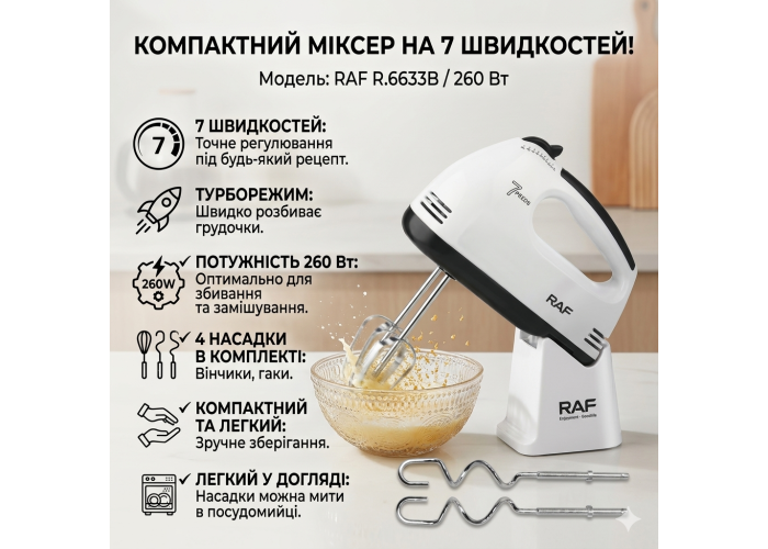 Ручной миксер для кухни на 7 скоростей RAF R.6633B 260 Вт Кухонный электрический миксер