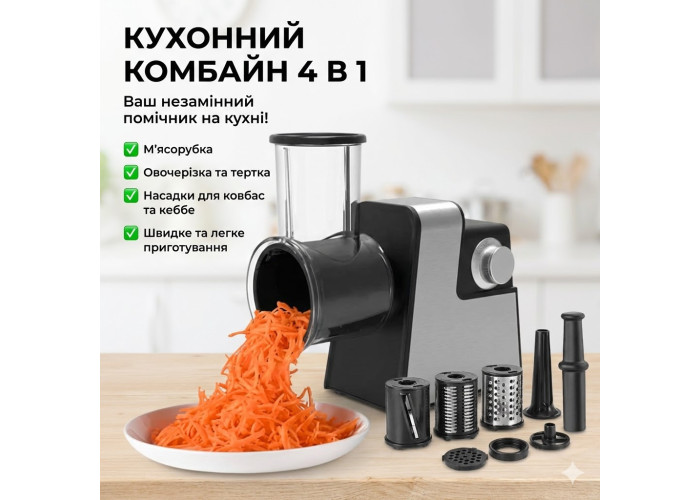 Система 4-в-1: Мясорубка + Овощерезка + Терка + Соковыжималка.