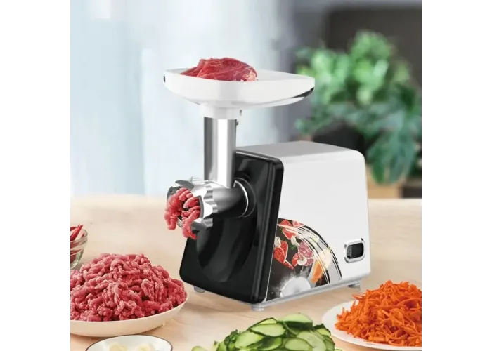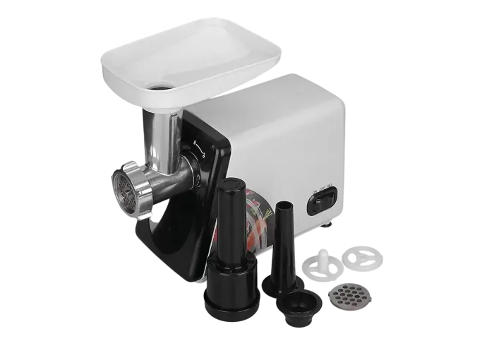 В комплект входят 2 решётки с разным диаметром отверстий, что даёт возможность регулировать степень измельчения фарша для различных рецептов. Также предусмотрена специальная насадка для приготовления домашних колбас. Устройство оснащено функцией защиты двигателя от перегрева и перегрузки, что гарантирует безопасность использования и увеличивает срок службы прибора.