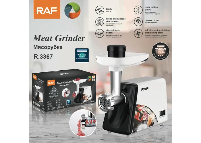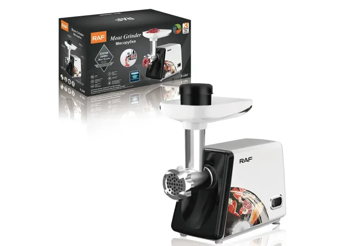 Электрическая мясорубка RAF R3367 — это мощное и удобное устройство, созданное для быстрого и качественного приготовления фарша, переработки мяса, рыбы, овощей и фруктов. Благодаря мощности в 2500 Вт мясорубка позволяет перерабатывать до 1,2 кг продуктов за минуту, что существенно экономит ваше время на кухне.