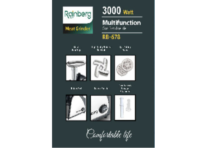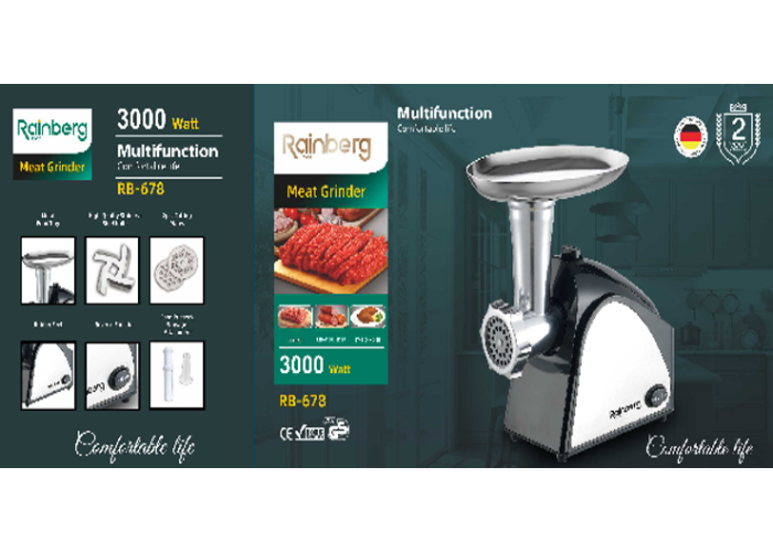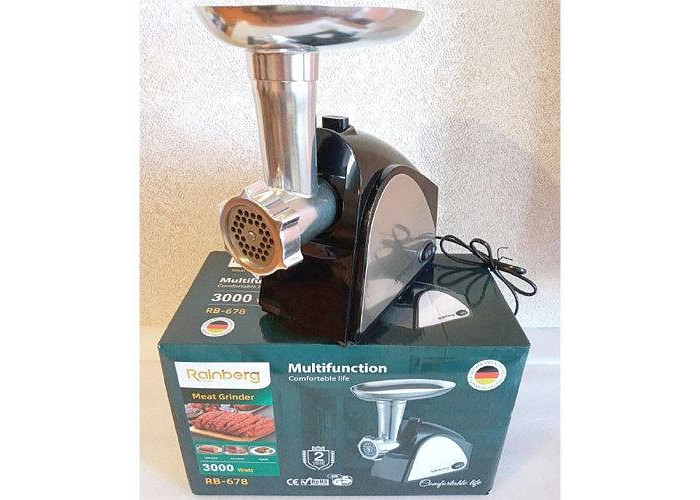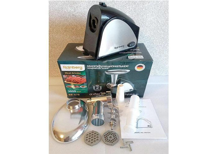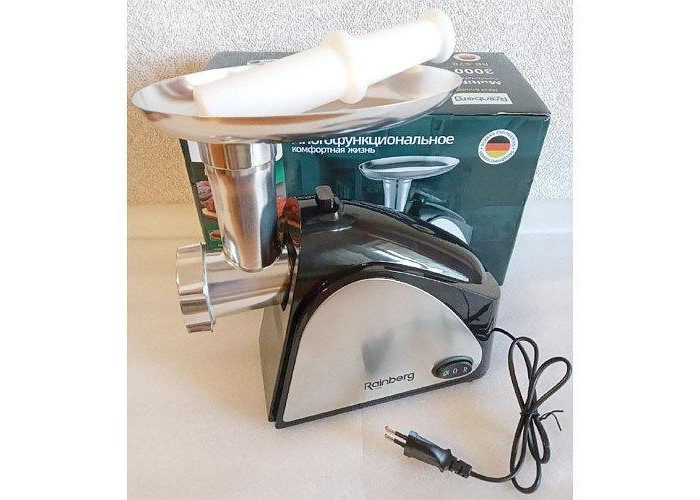 Мощная, компактная и тихая электрическая мясорубка от производителя Rainberg мощностью 3000 Ватт. Мясорубка предназначена для изготовления фарша из мяса, рыбы, грибов и т.д. Производительность данной мясорубки 1.5 кг/мин.