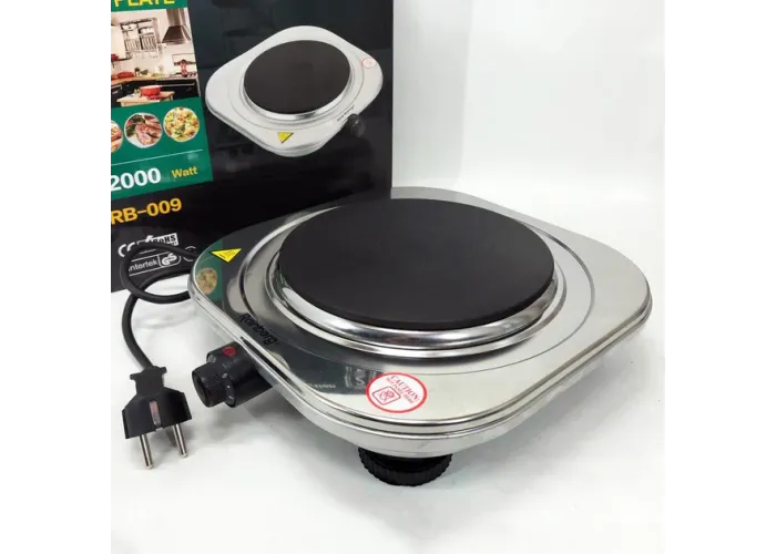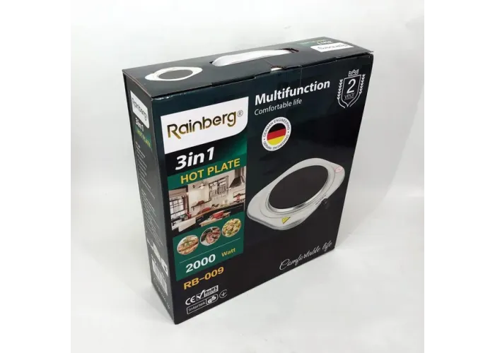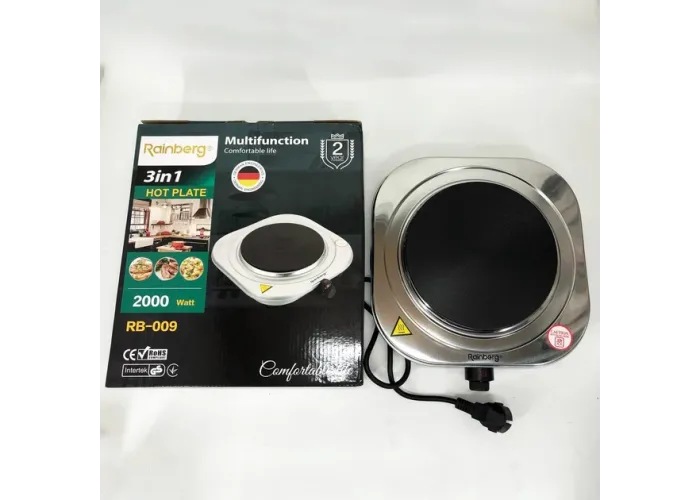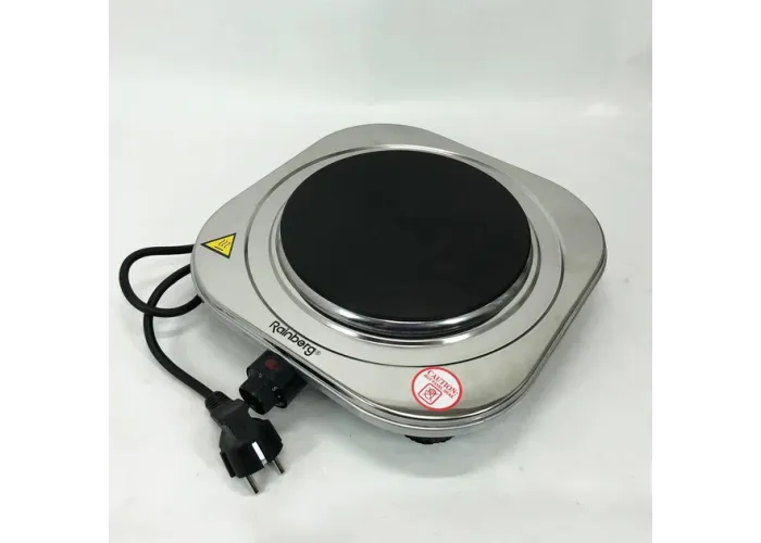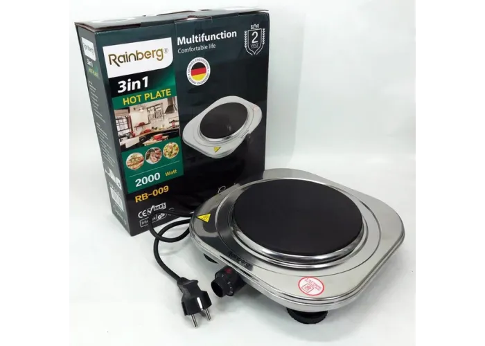 Электроплита одноконфорочная Rainberg RB-009 2000Ват 27*30см дисковая нержавейка Электроплита Rainberg RB-009 это экономное и малогабаритное устройство, оснащенное одним маломощным чугунным нагревателем, мощностью 2000Вт с регулируемым термостатом Покрытие рабочей поверхности нержавеющая сталь Если у вас немного места на кухне, то RB-009 станет незаменимым помощником на вашей кухне или любом другом месте А благодаря легкому весу, ее можно взять с собой на дачу Питание от сети 220В Порадуйте полезными и вкусными блюдами своих родных и близких, теперь на вашей кухне станет больше свободного места