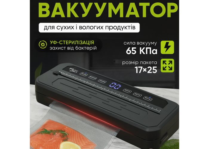 Food Vacuum Sealer — это универсальное устройство для вакуумной упаковки продуктов в домашних условиях. Подходит для сухих и влажных ингредиентов: мясо, овощи, фрукты, рыба, снеки и т.д. Позволяет значительно продлить срок хранения и защитить продукты от влаги, окисления и неприятных запахов.