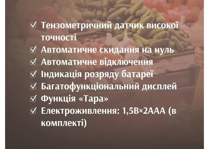 Функции: Обнуление тары; Автоотключение; Выбор единиц измерения; Индикатор перегрузки;