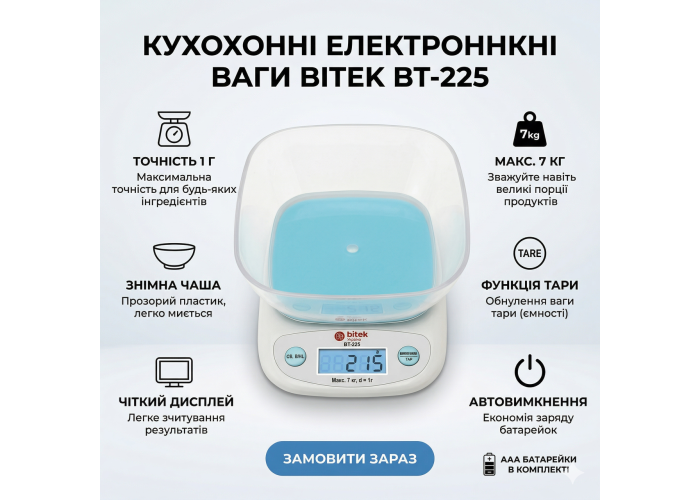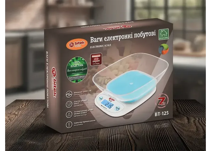 Весы кухонные электронные до 7 кг BITEK BT-125 точность 1 г белый с голубым