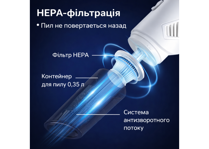 Пылесос работает от аккумулятора, что обеспечивает мобильность и удобство использования без подключения к электросети. Компактная конструкция позволяет легко хранить устройство и использовать его в ограниченном пространстве. Контейнер для пыли легко снимается и очищается, а набор насадок расширяет возможности применения пылесоса.