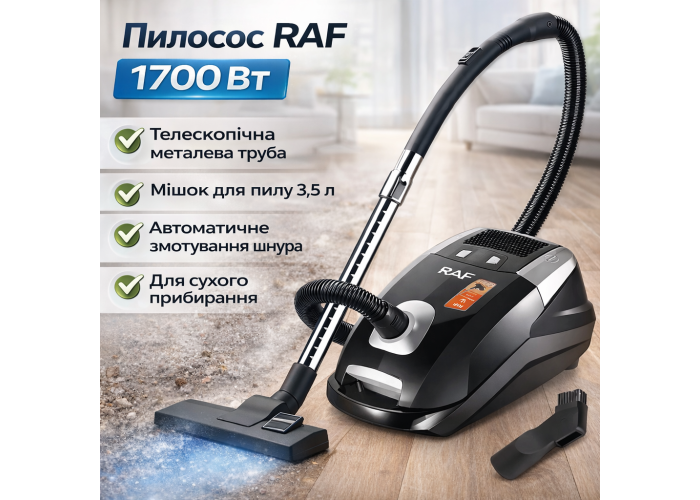 Бытовой пылесос с телескопической трубой и автосматыванием шнура RAF R.8702B 1700W