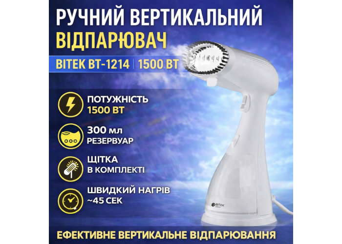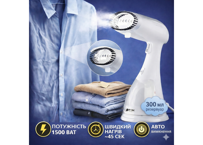 Ручной вертикальный отпариватель для одежды на 300 мл и мощностью 1500 Вт BITEK BT-1214 Белый