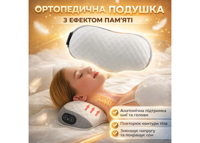 Ортопедична подушка для сну з ефектом пам'яті забезпечує правильну підтримку голови та шиї під час відпочинку. Наповнювач повторює контури тіла, допомагаючи утримувати хребет у природному положенні та знижуючи навантаження на м'язи.
