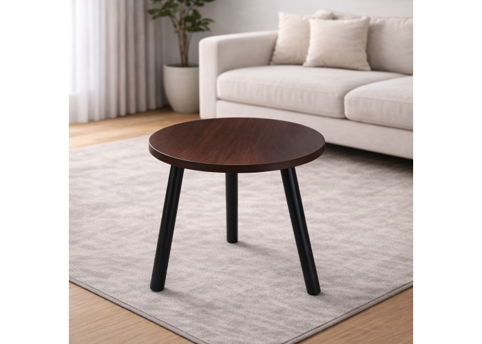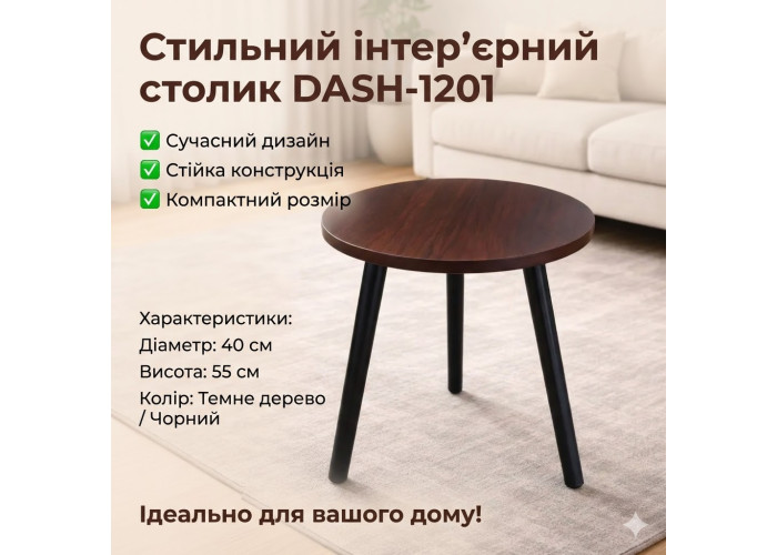Інтер'єрний столик DASH-1201 — компактний круглий столик у сучасному скандинавському стилі. Лаконічний дизайн і відтінок «темне дерево» дають змогу легко вписати його у вітальню, спальню або офіс, не перевантажуючи простір і доповнюючи навіть наявний інтер'єр.