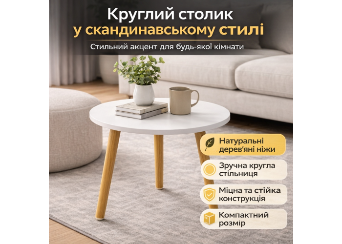 Конструкція спирається на три дерев'яні ніжки, що забезпечує стійкість на різних типах покриттів. Міцна стільниця з гладкою поверхнею легко очищається від пилу та слідів від кухлів, витримуючи щоденне використання. Столик постачається в розібраному вигляді, збирання просте та не вимагає спеціальних інструментів.