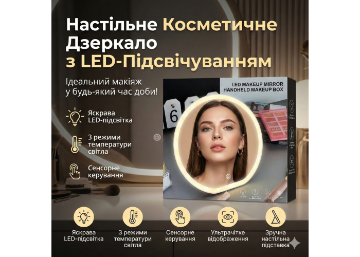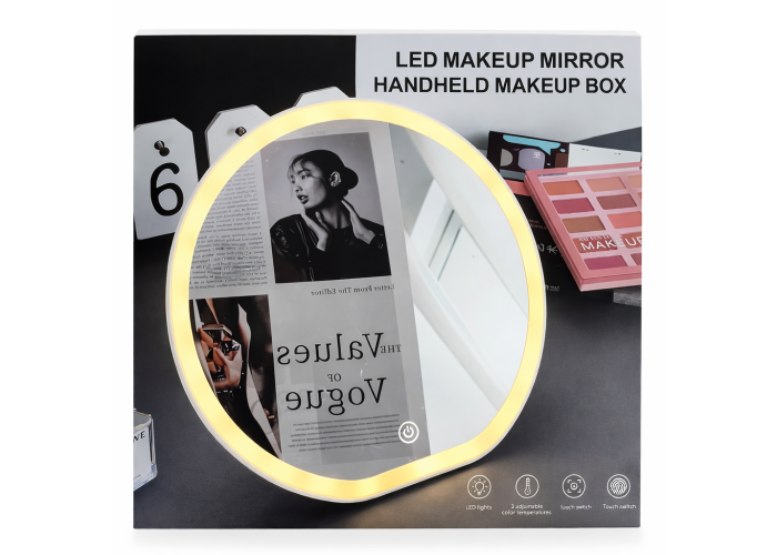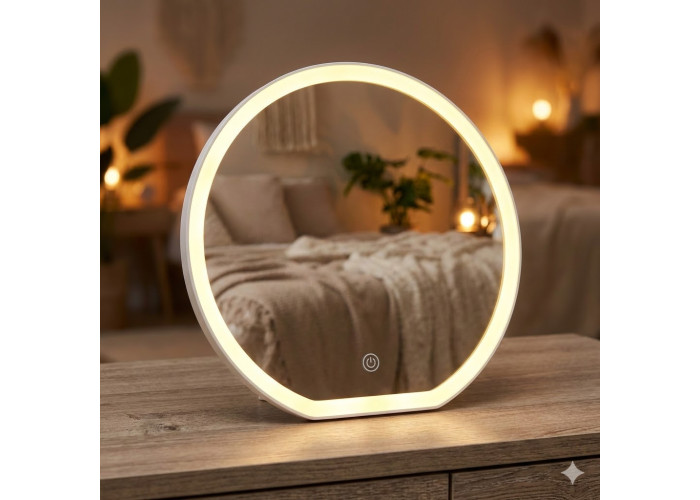 Настільне косметичне дзеркало з LED-підсвіткою призначене для повсякденного макіяжу та косметичних процедур у домашніх умовах. Дзеркало встановлюється на рівну поверхню й забезпечує додаткове освітлення обличчя, що допомагає точніше наносити макіяж і проводити процедури з догляду. Використовується як аксесуар для туалетного столика.