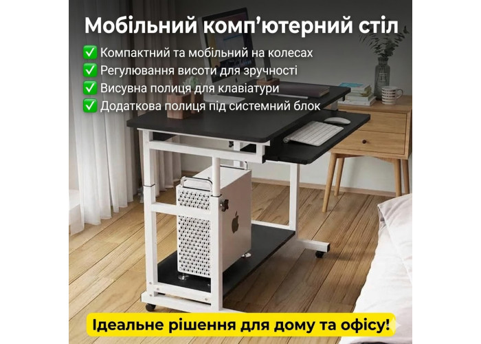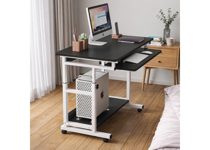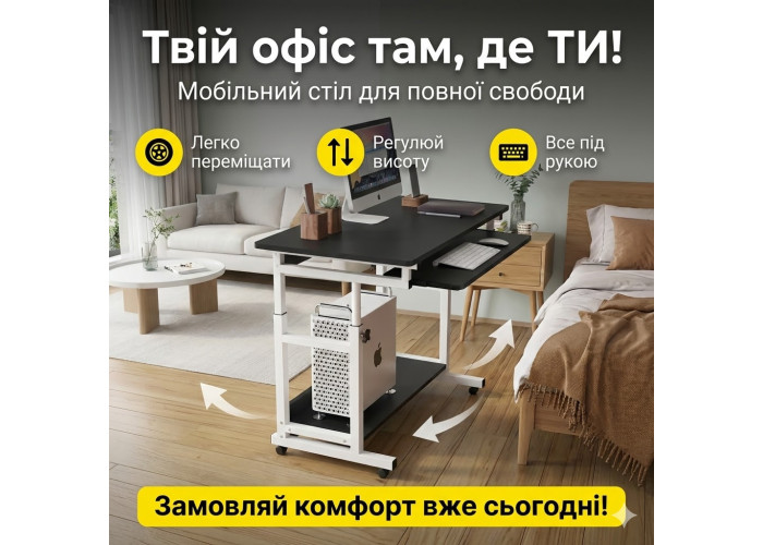 Головна перевага цієї моделі — можливість регулювання висоти (від 60 до 80 см), що дозволяє налаштувати стіл під ваші індивідуальні потреби: для роботи на офісному кріслі, дивані або навіть ліжку. А завдяки надійним коліщаткам ви зможете легко переміщати робоче місце в будь-яку точку кімнати.