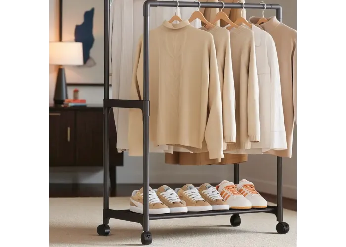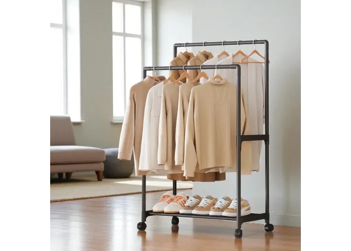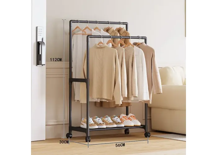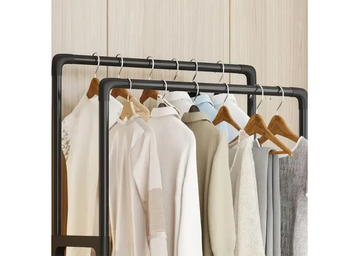 Ця компактна стійка-вішалка на колесах (модель YH9918-1)) призначена для зручного зберігання одягу та взуття в будь-яких приміщеннях. Вона обладнана двома перекладинами для розвішування речей і нижньою полицею для взуття, що дає змогу раціонально використовувати простір навіть у невеликій кімнаті. Легка конструкція та коліщатка забезпечують мобільність і зручність переміщення.